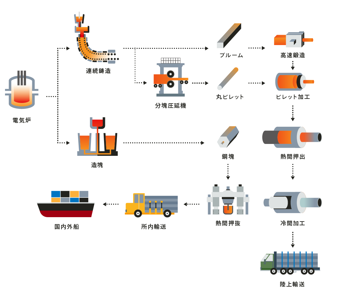 日本製鉄株式会社 関西製鉄所 尼崎地区は、高級継目無鋼管(つぎめなしこうかん)を専門に製造しています。
