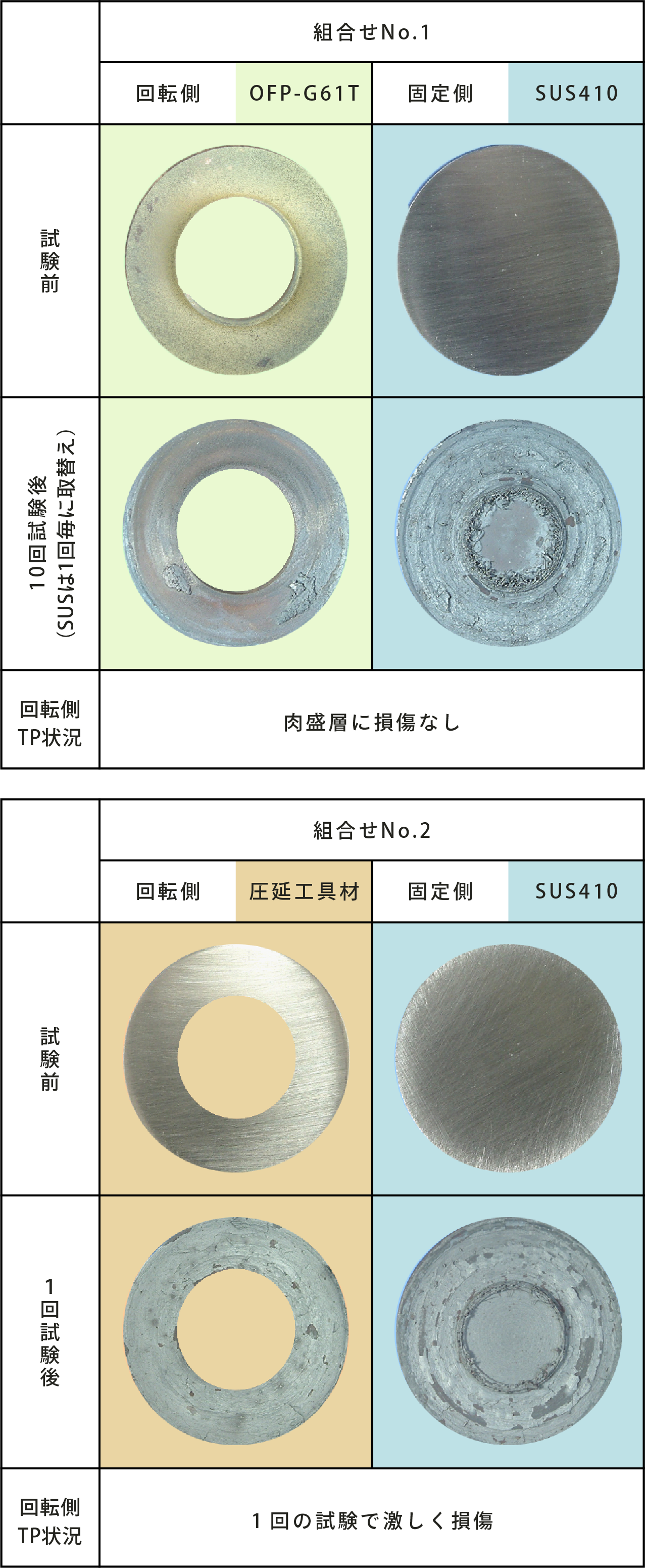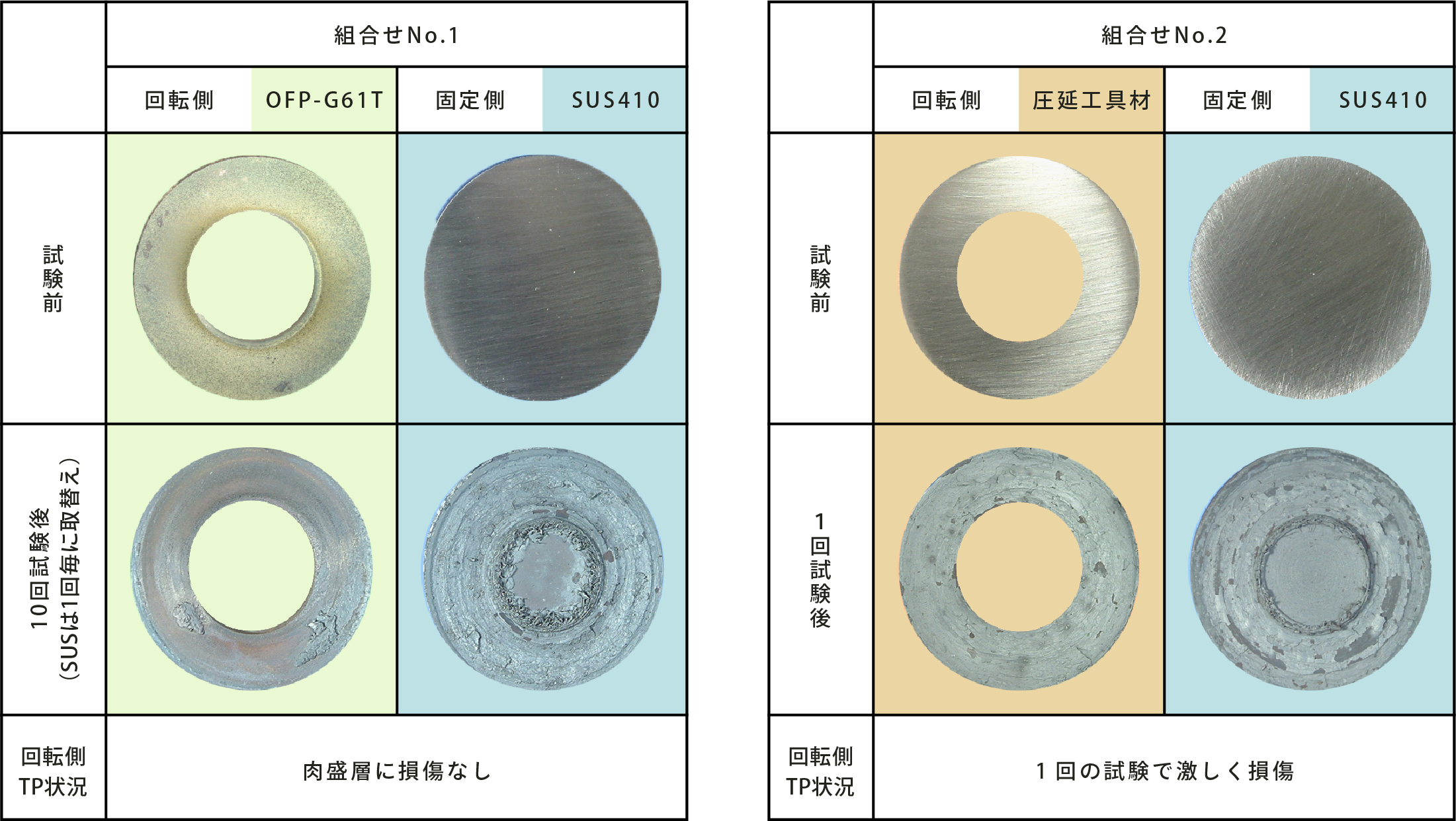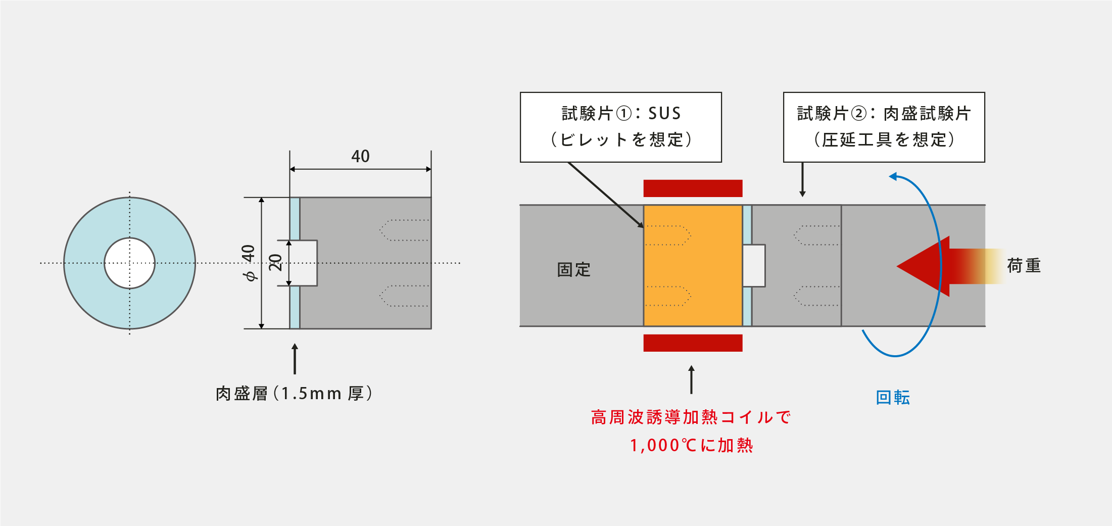 - 高周波誘導加熱装置にて1,000℃に加熱させた試験片①(ビレット想定)に、試験片②(圧延工具想定)を一定負荷で押し付けた状態で30秒間回転させ、試験後のTP表面状態を評価した。