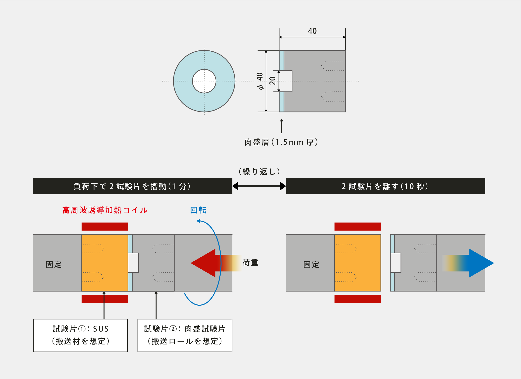 - 高周波誘導加熱装置にて1,200℃に加熱させた試験片①(搬送材を想定:SUS347)と、試験片②(ロールを想定)を一定負荷下で1分間摺動、ストップを繰り返し行いビルドアップ発生状況を評価した。
